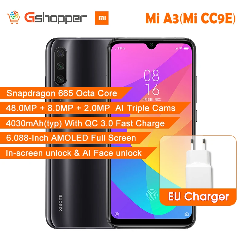Product Name: В наличии глобальная версия Xiaomi mi A3 mi A3 4 Гб 64 Гб 32 Мп + 48 МП камера 4030 мАч мобильный телефон Snapdragon 665 Восьмиядерный 6,088 "AMOLED