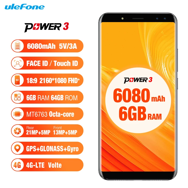 Product Name: Оригинал Ulefone Power 3 телефон смартфон телефоны смартфоны 6.0 "FHD + Экран 6080 мАч большая батарея смартфон Android 7.1 Face ID Touch ID четыре Камер 4G мобильный...