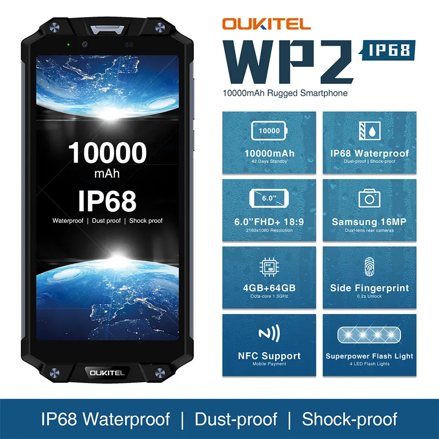 Product Name: OUKITEL WP2 10000mAh IP68 водонепроницаемый пылезащитный устойчивый к ударам мобильный телефон Восьмиядерный 4 Гб 64 Гб MT6750T 6,0 "189 смартфон с отпечатком...