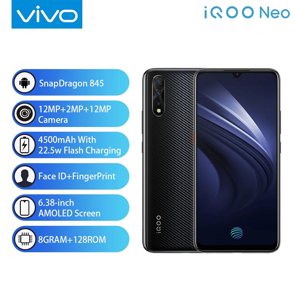Product Name: Оригинальный vivo IQOO Neo смартфон 6 ГБ 128 ГБ Android 9 Snapdragon 845 4500 мАч 3 камеры Super Amoled 6,38 "экран мобильного телефона