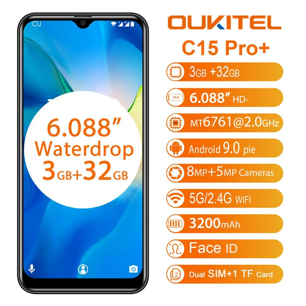 Product Name: Oukitel C15 Pro + 199 6,088 экран капли 3 ГБ 32 ГБ MT6761 Смартфон Android 9,0 отпечаток пальца лица ID 4G мобильный телефон