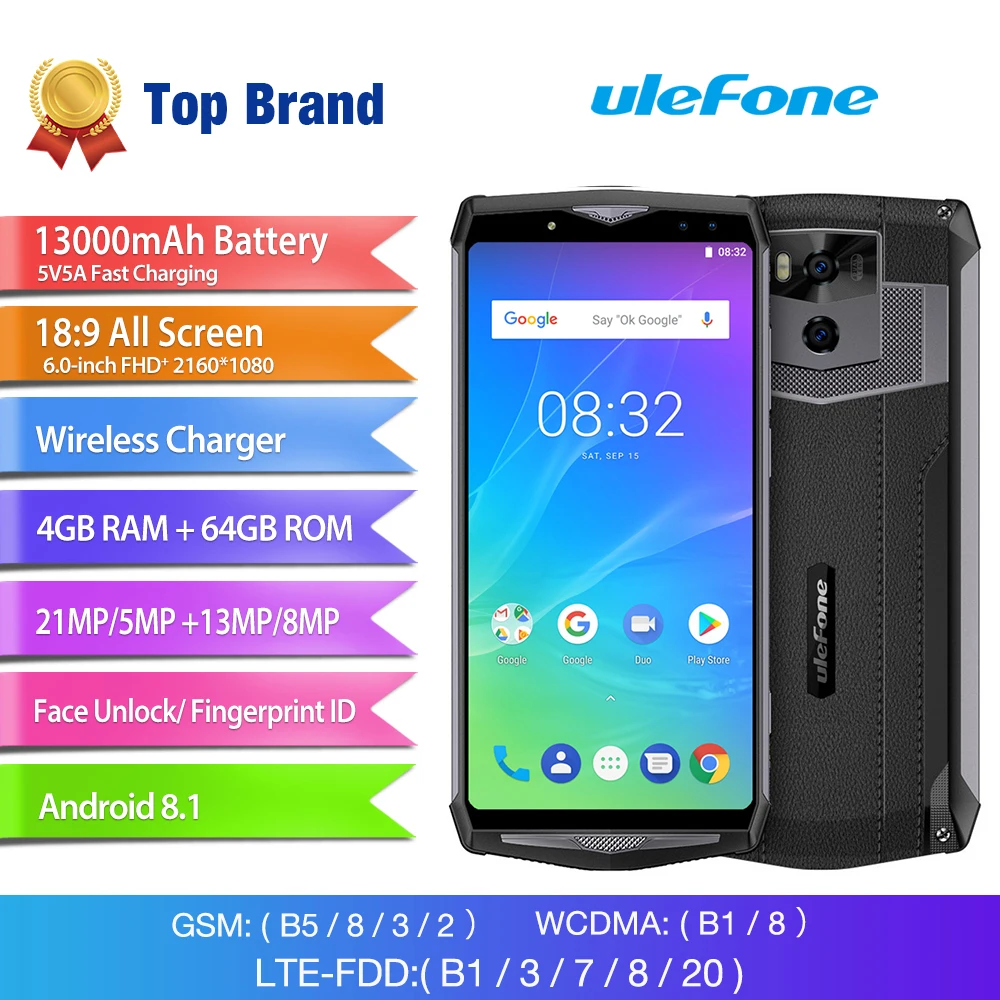 Ulefone Power 5s телефон смартфон телефоны смартфоны 13000 мАч мобильный телефон Android 8.1 6.0 "FHD MTK6763 Octa Core 4 Гб + 64 21MP уход за кожей лица ID беспроводной зар...Product Id: 32932208602